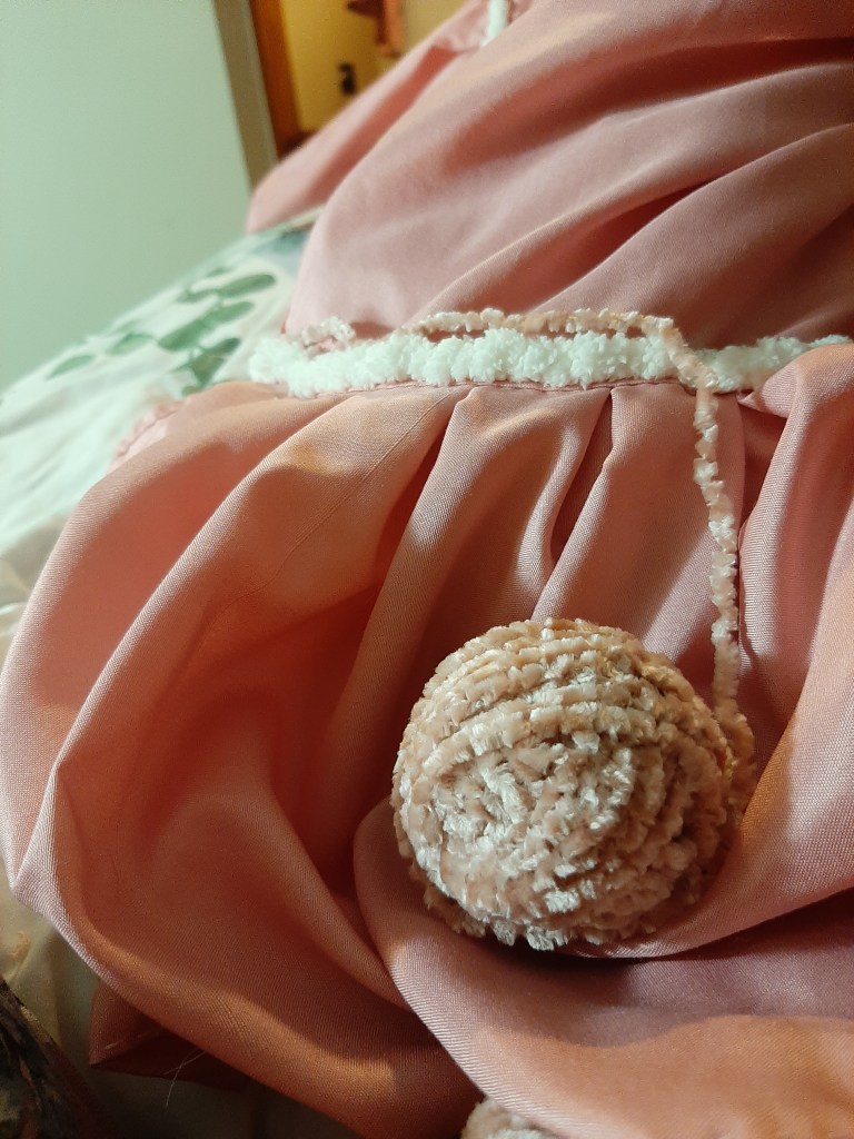 I found a gorgeous millennial pink chenille sweater at my favorite thrift store. I loved the hand of the material so I bought it and unravelled the whole thing. Along with an equally pink satin bedsheet and leftover yarn from a blanket I sold last Christmas, a new garment is coming to life.